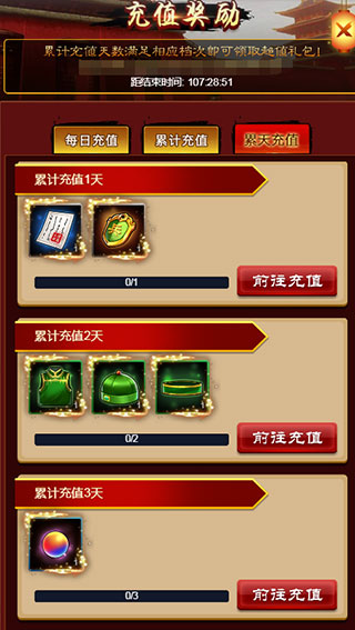 活动内容:在活动期间内,陛下累计充值可领取对应的充值天数奖励!
