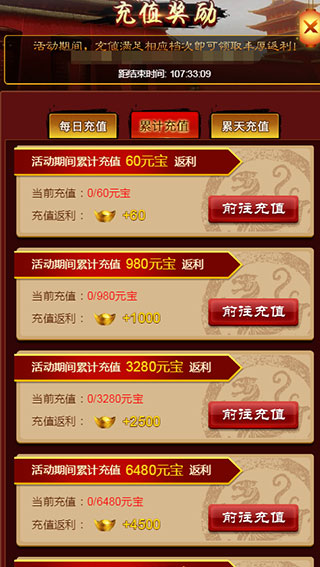 活动内容:在活动期间内,陛下充值可领取对应的充值元宝返利奖励