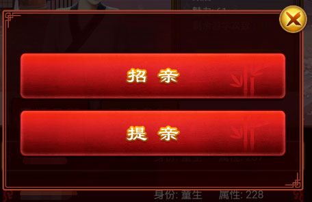 继续在红娘处点击进入,选择已待婚的子嗣点提亲,会看到提亲和招亲两种选项,提亲可两种方式: