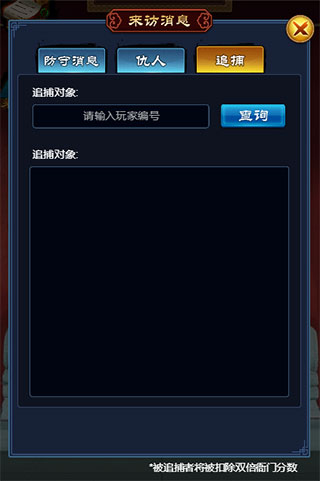 另外在衙门主界面左上角的【排行榜】中,老爷可以点击可以看到当前积分排行情况,若想对排行榜上的其他老爷进行指定挑战,需要消耗一枚缉捕令才能进行缉拿哦!