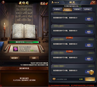 3、对了,对了!藏经阁中还准备了“明盏”、“ 明烛”、“ 明灯”等加速道具方便大人快速学习!如果大人邀请盟友前来助力,每名盟友可以减少30分钟学习时间!!每天3次,还不快约上盟友一起学习进步!
