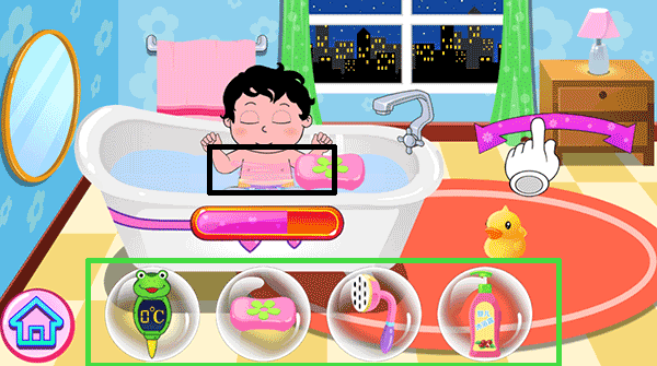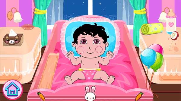 1、沐浴洗澡—在浴室里放好适温的洗澡水为宝宝洗澡,动动手指,触摸屏幕,为宝宝涂抹沐浴露、香皂,最后为宝宝冲洗干净。2、哄宝宝睡觉—在婴儿床上,为小宝宝涂上爽肤水,喂小宝宝喝奶、哄婴儿宝宝玩拨浪鼓,轻轻的为宝宝盖上被子,哄婴儿宝宝睡觉。促进宝宝们的大脑的发育、脑、手、眼的协调能力。