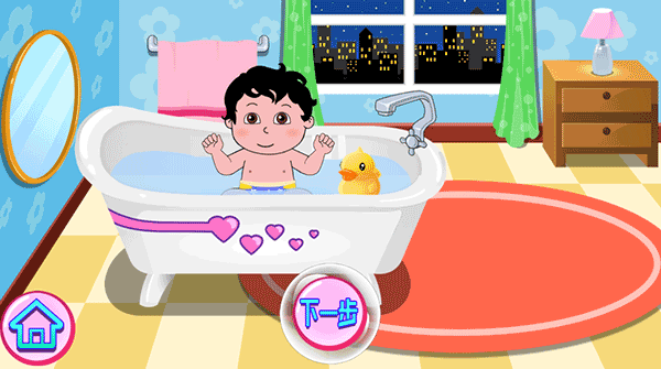 --沐浴洗澡:在浴室里放好适温的洗澡水为宝宝洗澡,动动手指,触摸屏幕,为宝宝涂抹沐浴露、香皂,最后为宝宝冲洗干净;