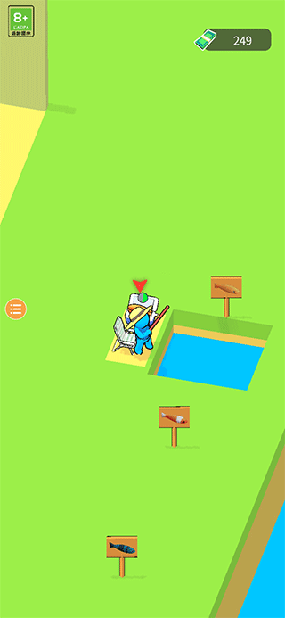 1、进入游戏后,首先玩家需要走到鱼塘边,消费后获得钓鱼工具钓鱼
