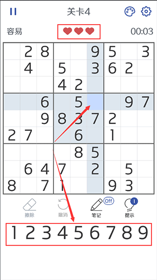 2、选择你需要挑战的数独玩法,每局游戏你有三次错误的机会,你需要将所有未填的数字填入,同时横、竖和宫格内不能出现相同的数字;