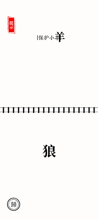 将图中的羊字,移动到题目羊上面,然后获得咩,将咩移动到狼上,然后狼吃掉了羊,就剩下一个口字,口可以用来补掉栅栏缺失的部分。