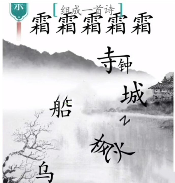 3、接着把【雨】【木】【目】放到天上组成【霜】,再往右拖动形成一排,这样就完成了第一句诗【月落乌啼霜满天】,