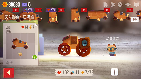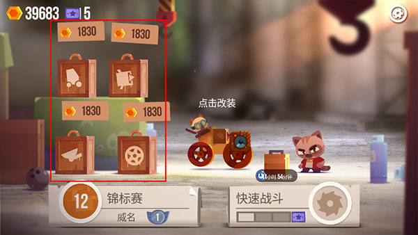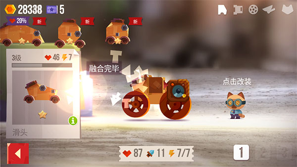 1、喵星人大作战中文版最新版的游戏操作十分简单,说白了就是两辆车互怼,看那一个车能笑到最后;2、车身分为经典、泰坦、浪板、滑头以及磐石;