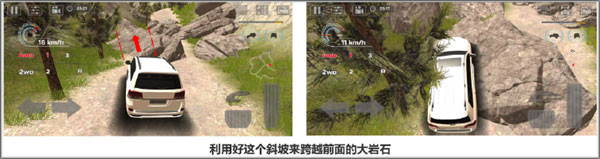 由于本关中车辆性能较差,所以无法直接跨越巨岩区域。通过的方法如图所示,在图1中找到斜坡,借用惯性一口气冲上大岩石。