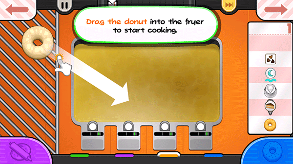 这是比较关键的一步,玩家的甜甜圈需要油炸之后才可以出炉,具体的油炸程度可以看炉子中的计量槽,计量槽颜色越深则甜甜圈越接近深色则表示甜甜圈接近完成,尤其需要注意的甜甜圈有两面,一定要两面都炸过才行,另外还要牢记不能炸太久。
