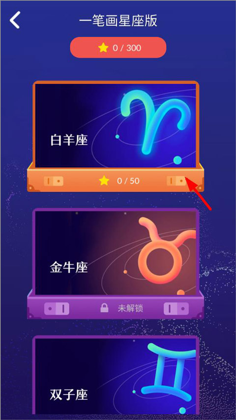 3、每个星座主题内有50个小关卡,玩家需要从第一关开始,持续游戏并解锁其他关卡,点击选择第一关;