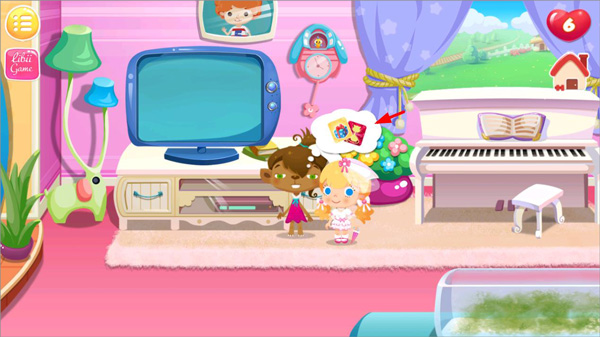 2、看,小糖糖在这儿呢,现在你可以带着她在家里四处走动啦,乖宝宝糖糖可是大家眼里的小甜心,玩耍之余还不忘做家务呢;