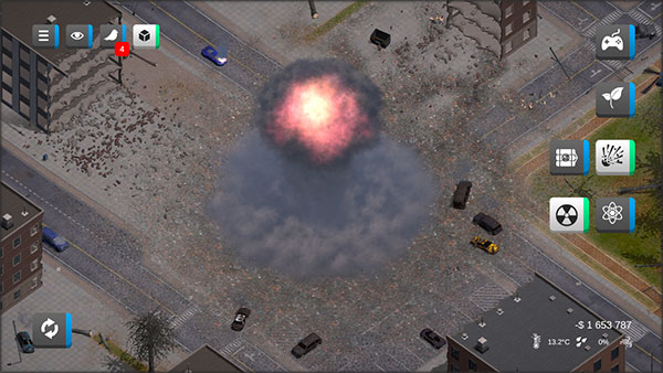 同时游戏中玩家可以操纵多种种史诗级灾难来破坏城市,如地震、龙卷风、核武器、外星飞船等,玩家可以自由选择,随意的对城市进行破坏,释放你埋藏已久的负面情绪。