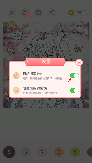 2、进入涂色界面后,点击上方的设置图标,点击右侧的开关即可关闭啦。