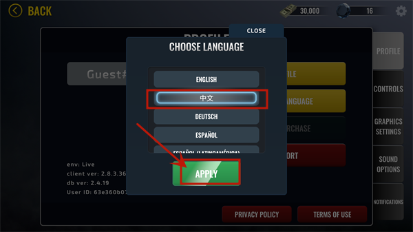 3、如图,在弹出的语言选择框内选择【中文】,最后点击“APPLY”即可完成中文设置。