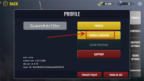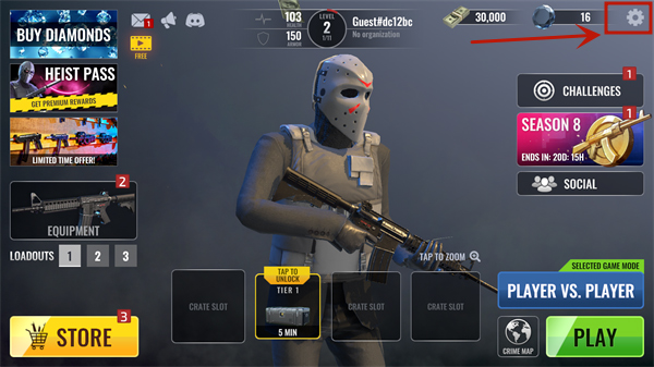 1、打开武装掠夺官方正版,进入游戏后可以看到游戏默认为英文,选择右上角【齿轮】图标进入设置界面,