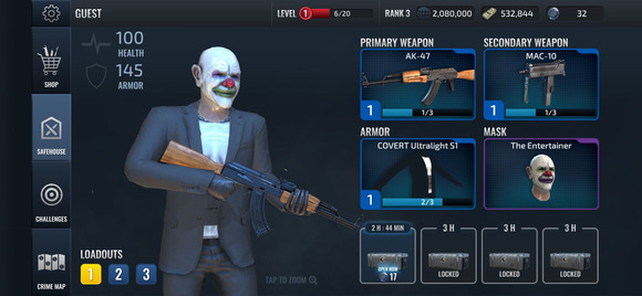 2、有11张可选地图,从小规模的珠宝店突袭到帮派出动的大银行金库洗劫,不同的任务会带来不同的感受,当执行的任务越来越大时,获得的奖励也越来越好,越来越多,