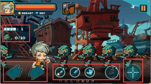 玩家点击屏幕下方按钮,控制人物左右移动以及射击。不过如果前后僵尸夹击的话,恐怕离死期不远了。游戏中,玩家要完成一个个人物来获得奖励,用这些奖励来升级人物的生命、速度等属性,或购买更强的武器装备,而人物选择方面就只能用人民币来购买了。