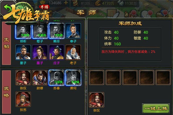 武将系统是游戏的一大亮点,你可以招募像白起、孙膑这样的历史名将,通过进阶和升级提升他们的属性,组成强大的阵容征战天下。此外,军师系统的加入也为战斗增添了更多的策略性,文韬军师能全面提升全队属性,而武略军师则能对敌方阵型产生克制效果。