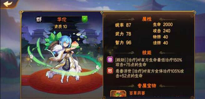 解析:(治疗加辅助类型 的武将,伤害其实并不高,但是治疗效果却是很好,属于那种奶妈前茅的那种,所以新手还是可以选择的。而且得到也不算太难。武将商店有卖,普通副本里面也有,适合后排。)