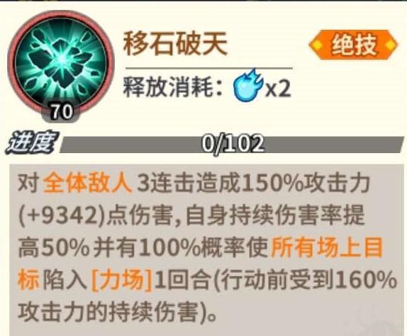 绝技集高额爆发以及持续伤害一体,伤害与自身攻击力值相关,不仅可以通过施放绝技对敌人造成直接伤害,还可以使场上所有目标陷入【力场】,造成持续伤害,并通过持续伤害率提高进一步增加持续伤害效果。该绝技的亮点在于施放后【力场】效果对不灭倒地的单位依然有效,并且持续伤害效果在敌方行动前触发。