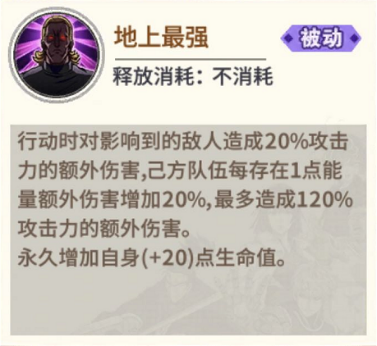 [地上最强]被动技能可使King作为辅助为团队增益的时候,兼顾有一部分输出。因其伤害量与我方能量值成正比,故体现了King先手的必要性,在开局3点能量时先手,就可以对敌方全体造成80%攻击力的额外伤害。若搭配蚊女、深海王等可以大量回火的核心,在King出手时只要有5火,即可达到120%攻击力的最大化AOE输出。需要明确的是额外伤害虽无法享受崩坏、受伤、暴击、暴伤、暴走等效果加成,但同样也不受防御及坚韧的影响,在对阵背心、深海王等主流肉盾时King可以无视对方[坚韧]效果,有奇效。