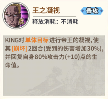 [王之恫吓]该绝技是目前版本中为数不多能够封锁能量的技能。King走向战场中央恫吓敌方数次,每次造成1点伤害(可以触发暴击、格挡等效果),同时封锁对方2点能量值。除此之外,更为卓尔不群之处在于回复能力,50%攻击力的群体回复效果,能够在关键时候帮助队伍稳定血线成为队伍的定海神针。实战中,抢一速先手可以有效抑制目前盛行的“一波流”;若置于“回复流”中,可配合基诺斯博士被动,更有锦上添花之效,为友方全体增加20%~30%攻击力, 不仅从弥补了自身输出短板,同时也放大了被动技能的收益。