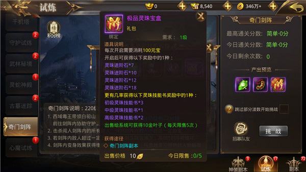 在奇门剑阵里我们能获得灵珠相关的材料,还有机会通过打开灵珠宝盒获得灵珠技能书,当然如果你想省点元宝的话,也可以直接把宝盒买了,换点金叶子也是非常不错的。