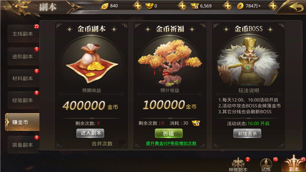 在每日挑战里我们可以找到三个赚金币的方式,分别是金币副本、金币祈福和金币BOSS,其中金币祈福需要消耗元宝,价值不大;金币副本每日有3次机会,全清的话大概有100万左右的金币收入;而金币BOSS有时间限制,大家记得准时参与,奖励是非常丰富的,可以通过换线的方法尽可能多地击杀boss。