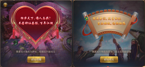 要解锁结婚结义系统,前提是需要玩家等级达到123级。想要结婚的话必须是异性角色,而想要结义则必须是同性角色,不过游戏里比较特殊的是,结婚和结义,你只能选择一个进行,也就是说情缘与知己不能兼得,虽然这玩法有点小小的反人类,但考虑到情缘和知己有可能打起来的情况,个人表示还是能理解的。