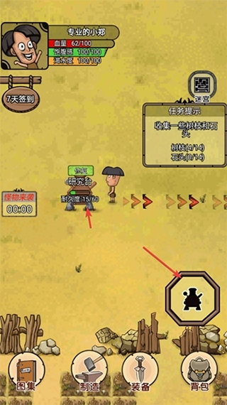 首先做一套皮制衣服,血量300以上即可,做个武器。把修复台做出来。野兽来袭就进副本再出来,就可以躲开。进副本刷怪,黄金关卡开了就可以了。