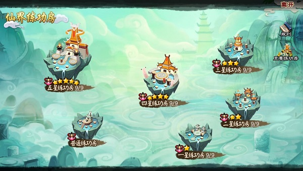 练功房共分为6个房间,分别为:普通练功房、一星练功房、两星练功房、三星练功房、四星练功房、五星练功房