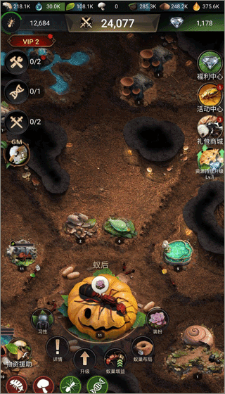 1、新增基因进化系统(蚁后25级且变异菌丛25级时,任意一个基因星级达到满级后解锁对应进化);