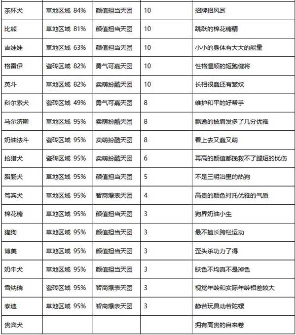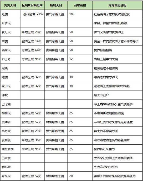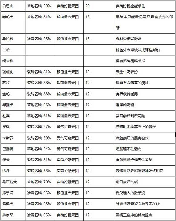 *注:以下狗狗的召唤区域以召唤概率最高的区域进行列出,未在表中列出的狗狗有可能是通过其他方式获取哦,比如放置礼盒挑战。