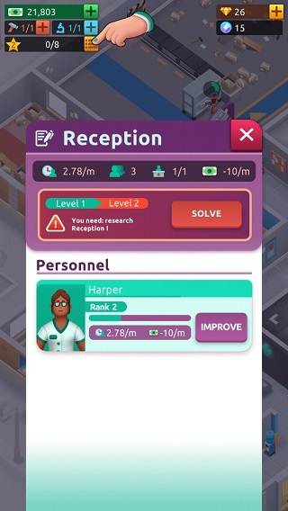医院帝国大亨手机版是一款以点击+放置为主的模拟经营类游戏,游戏中玩家管理着一家医院,你的任务便是通过不断解锁的新科室,来扩建医院规模,通过建设完整的医疗体系,帮助患者解决各种疑难杂症。俯瞰式的2.5D视角,能够纵览整个医院场景,根据每日医院动态,及时调整策略,在满足患者治疗需要的同时,提升服务质量,缩减治疗时间。