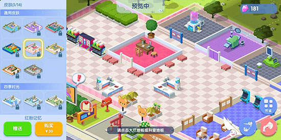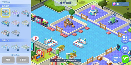 第二步:点击“皮肤”这个小标之后,在页面的左边会弹出一栏皮肤选择,玩家可以根据喜好来更改皮肤,想要换皮肤的时候,玩家需要先点击左侧的皮肤,然后点击大厅的地板和科室的地板,就可以成功换皮肤了。科室和大厅的地板是可以不同的,也就是说,可以由很多款皮肤组成一个专属于自己的。