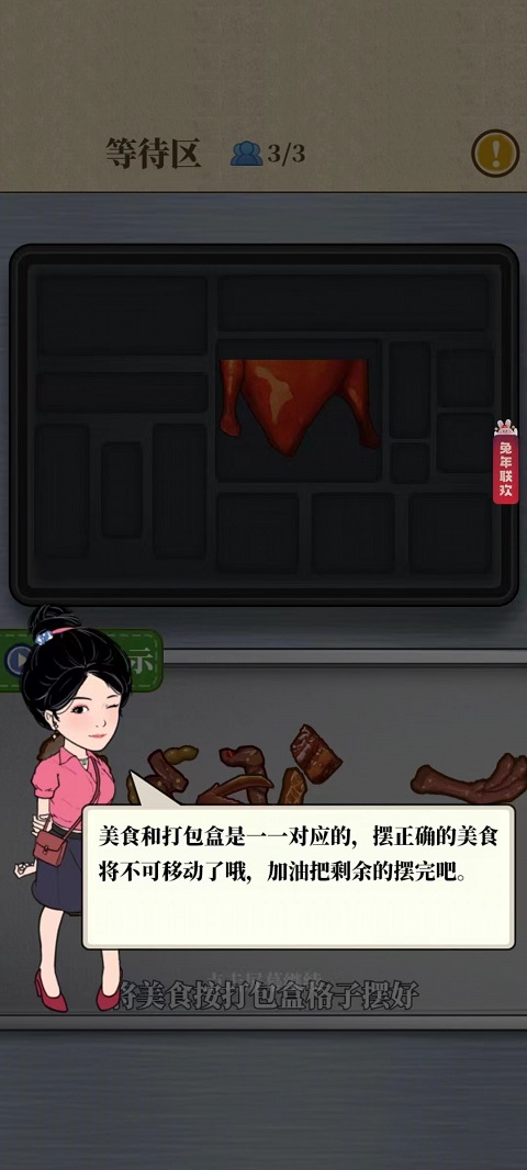 ③将美食放置打包盒内一一对应,摆正确的美食将不可移动了哦,大家切记观察仔细来啦。