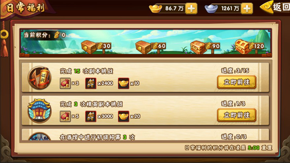 【每日必做1】挑战剧情副本挑战剧情副本,可以获得大量的资源,包括武将经验,银两,武将碎片,装备碎片和进阶用的护脉丹。前期剧情副本难度不高,每日每关都重置,每关可扫荡5次。固定获得最基础的资源,每天上线后记得尽早打晚。