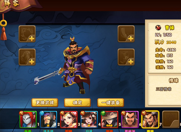 进入阵容界面,阵容界面显示武将基本属性,装备,和情缘