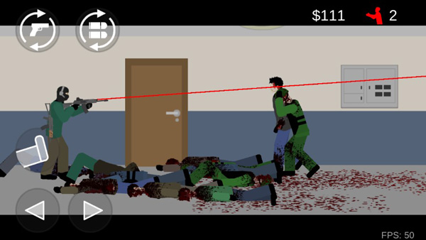 分别是往左走和往右走,左上角分别是换枪和换子弹,右下角的是一个保命技能,僵尸如果靠近你你可以用踢腿运动将它踢倒或者后退,游戏中最多可以一次踢到两个僵尸,运用好该技能你将会轻松许多,顺带提一下,游戏中你用枪射击僵尸腿一次会得到2块钱,射击僵尸身体一次会得到5块钱,射击僵尸头部一次会得到10块钱,好像没什么不对的。