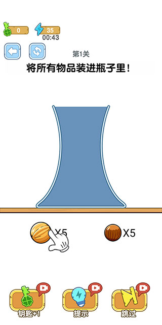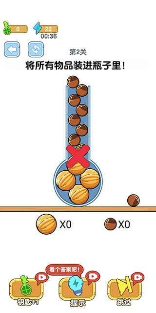 5、如果未能将所有物品装进瓶子里,使其凸出或者掉落就会失败。