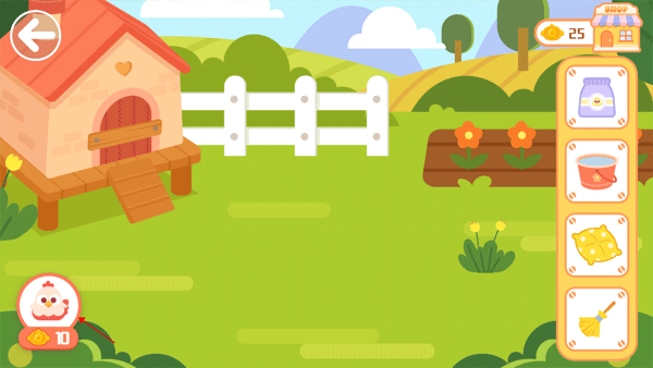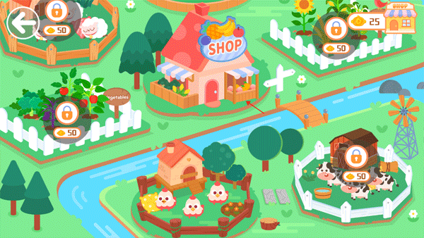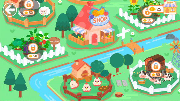 收获的果实、小动物的产出物可以收集到商店里一起售卖给需要的顾客哦!赢得的金币可以扩大我们的农场资源,快来获取更多金币吧。