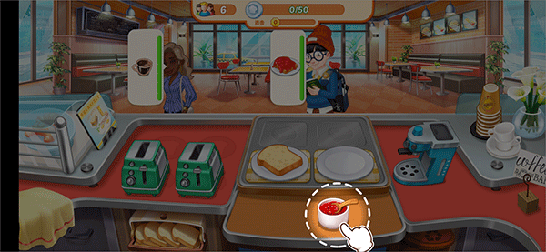 1、进入游戏后,会有客人来进行购买食物,你需要按照客人的需求完成美食的制作,例如客人需要一个番茄酱的面包