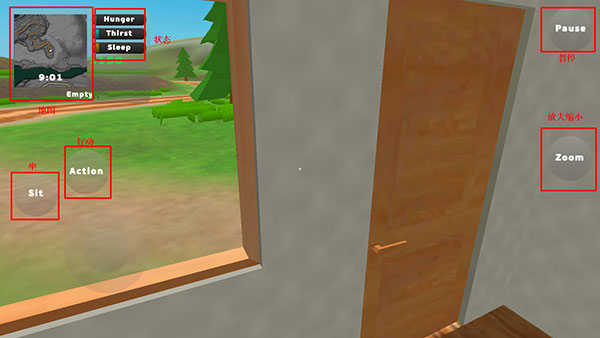 2、游戏操作很简单,左边可以控制方向移动、站坐、行动还有显示地图和状态,右边可以放大缩小视角;