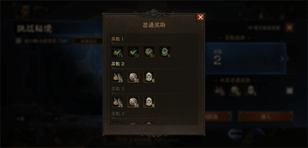 完成单人挑战或者组队挑战的每一层都会获得万能材料、荣誉和符文。