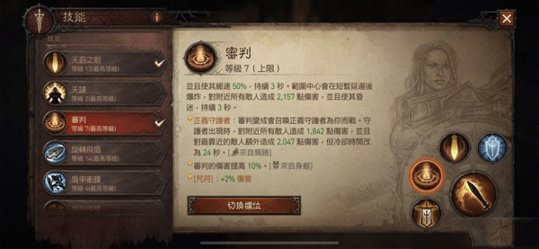 (2)肩膀:审判晕怪两秒并且召唤一个大天使来帮你输出。(超核心,cd和战旗一样长,同时释放效果惊人。输出爆表他砍一刀是你砍一刀的两倍伤害,还可以挡刀,挡各种投射物。晕两秒也很珍贵,野外晕地精打死,宝库晕守卫。)