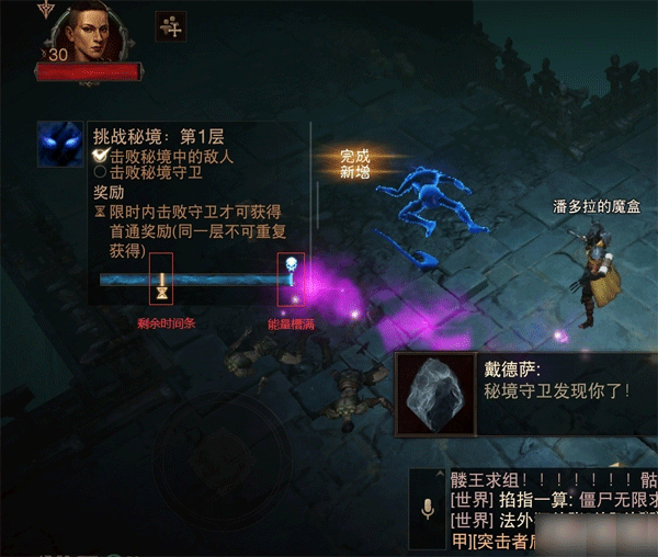 需在在限定时间内击败杂兵及秘境守卫。首先需要击败杂兵,无需全部打完,每杀死一个杂兵会增加左上角的能量槽,待打满能量槽才会出现秘境守卫。所以挑战时请注意剩余时间条。