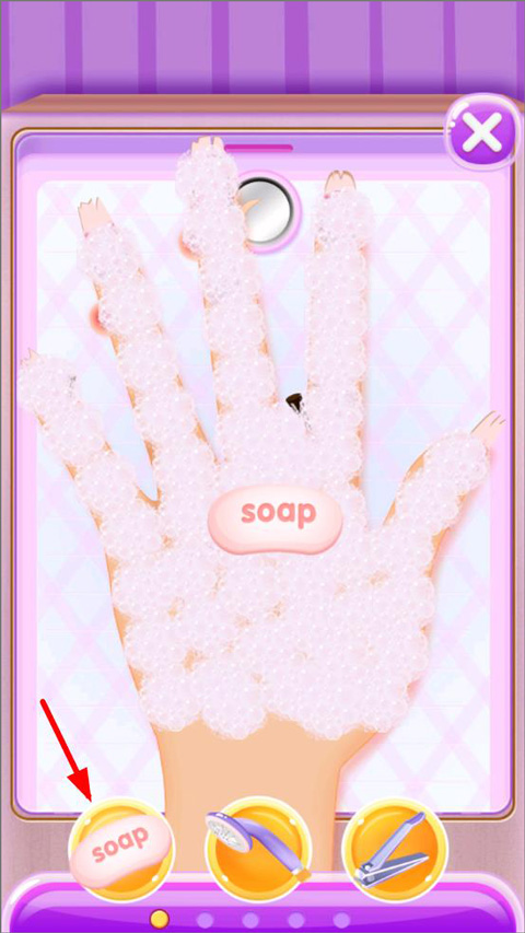 2、打开清洁屋后,玩家需要清理手部的污渍和修剪指甲,按顺序点击下方工具栏开始清理;