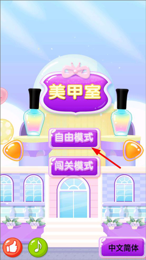 3、手部清理好之后,进入美甲室,美甲室要=要自由模式和闯关模式,玩家选择其中一种玩法即可;