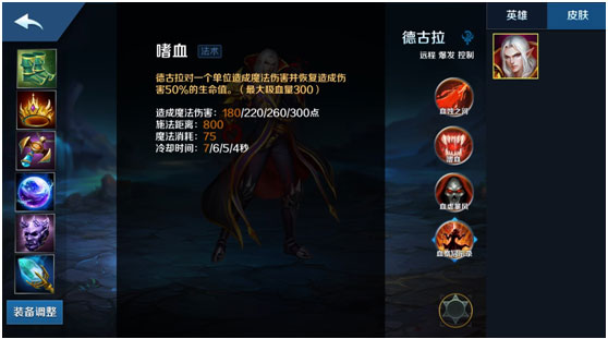 2、技能2嗜血:造成的魔法伤害的50%用来回血(最大回血300)。4秒钟一个吸血技能。没有一堆英雄的集火,很难秒掉德古拉。